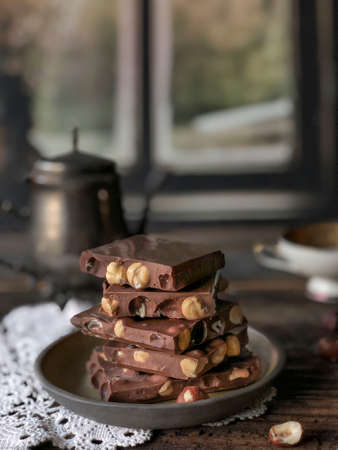 Milk chocolate pieces with whole hazelnuts. Chocolate bar / chocolate background/ nut chocolate / chocolate tower