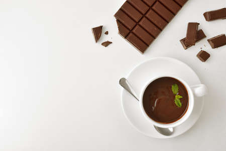 Hot chocolate in white ceramic mug and tablet and pieces on white table. Top view. Horizontal composition.