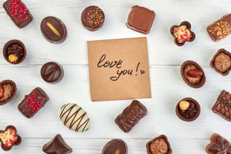 Assortment of chocolate sweets and Valentines Day card on white background, top view.