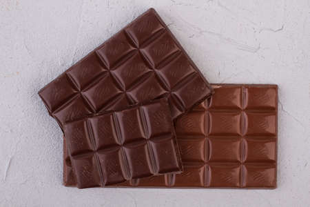 Milk and dark chocolate bars. Different chocolate bars on light background. Health benefits of eating chocolate.