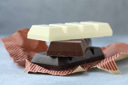 Dark, milk and white comemade chocolate factory background. Delicious chocolate pieces. Different mix chocolate bars.