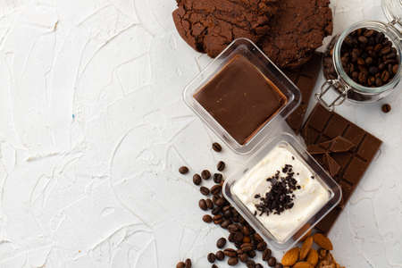 Cocoa mousse dessert in plastic transparent box on grey surface