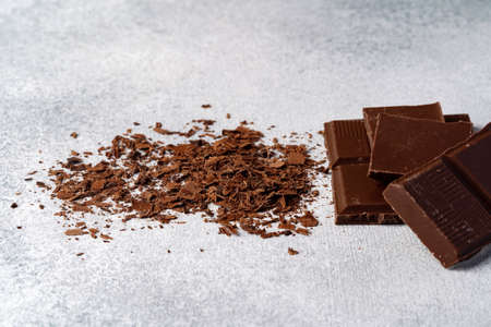 Grated chocolate and pieces of tasty chocolate on table