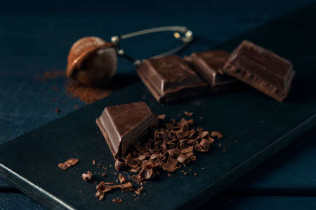 Pieces of chocolate, chocolate shavings and strainer with cocoa on the dark blue wooden table