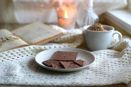 Plate with almond chocolate bar, mug with chocolate chip cookies, open book, reading glasses, soft blanket and lit candles. Hygge at home. Selective focus.