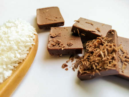 Coconut shavings in a spoon, pieces of milk chocolate on a white background