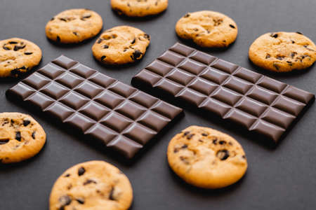 Dark chocolate bars near cookies on black background