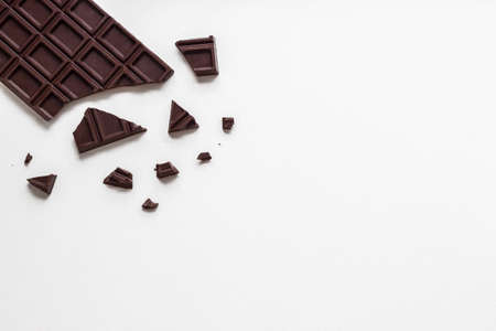 Broken chocolate bar on the white background with copy space. Scattered chocolate pieces.