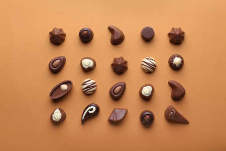 Tasty chocolate candies on color background