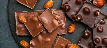 Pieces of tasty chocolate with hazelnuts and almonds on dark table, top view