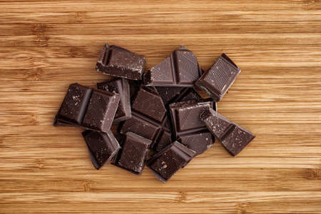 Heap of broken dark organic chocolate on a natural wooden background.