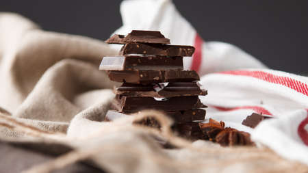 Chocolate bars on dark background with chocolate tower