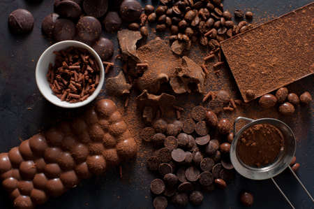 Assorted different types of chocolate. Broken pieces of dark, milk and white chocolate, with nuts, cooking chocolate, shavings. On a black stone concrete background, top view copy space
