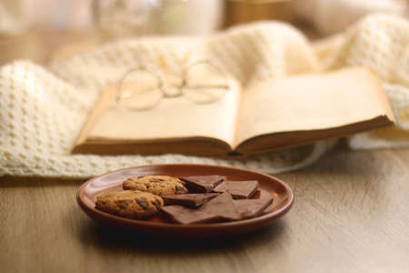 Open book, reading glasses, soft blanket and plate with chocolate and chocolate chip cookies. Hygge at home. Selective focus.