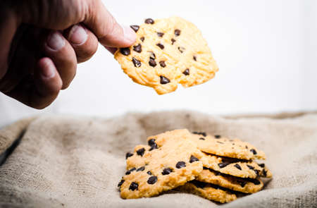 young man hand pick chocolate cookies