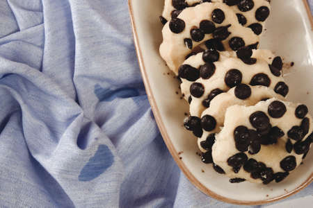 Directly above view of copy space by fresh chocolate chips over white background. unaltered, sweet food and unhealthy eating concept.