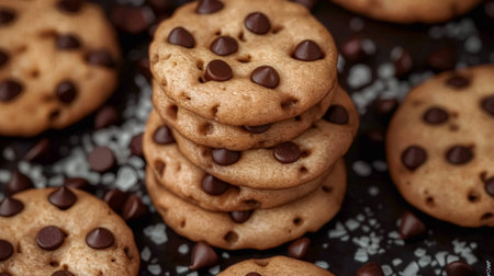 Chocolate chip cookies with chocolate drops on a dark background. Selective focus.