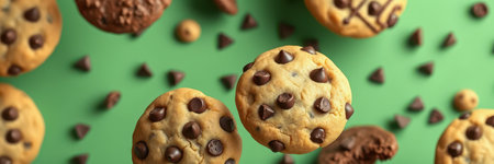 Delicious chocolate chip cookies floating on a vibrant green background surrounded by chocolate pieces