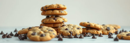 Freshly baked chocolate chip cookies stacked on a table with chocolate chips scattered around
