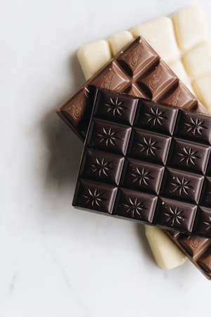 Milk and dark chocolate bars. Different chocolate bars on light background. Health benefits of eating chocolate.