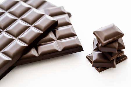 Rich dark chocolate bars placed on a clean white background, highlighting their smooth texture and deep color.