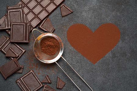 Background International Chocolate Day milky dark chocolate on a gray black background with a copyspace place for text.