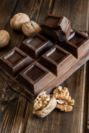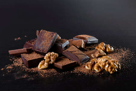 A pile of dark broken chocolate sprinkled with cocoa powder and walnuts on a dark background. copyspace.