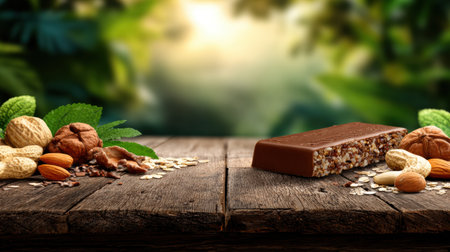Protein bar placed on a rustic wooden surface with assorted nuts and vibrant green leaves in the background, creating a natural sports nutrition vibe.