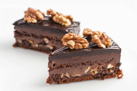 Two slices of rich chocolate fudge cake topped with glossy ganache and whole walnuts, isolated on a white background