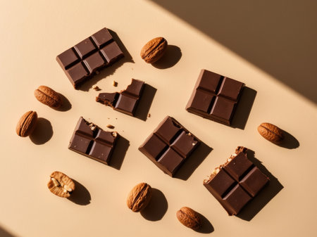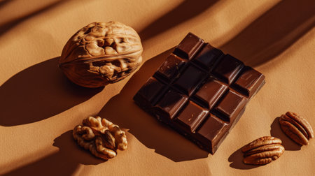 AI Generated. whole and broken chocolate bars with nuts on a beige background