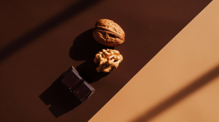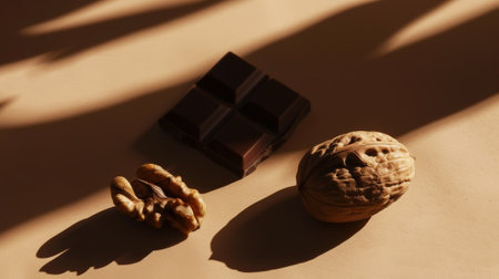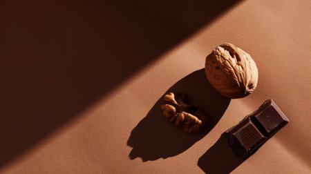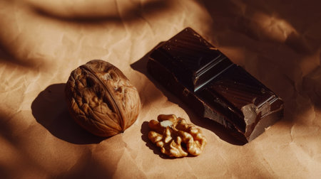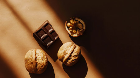 Peeled walnuts and delicious piece of dark chocolate on aesthetic dark brown background. Chocolate ad. Generative AI.