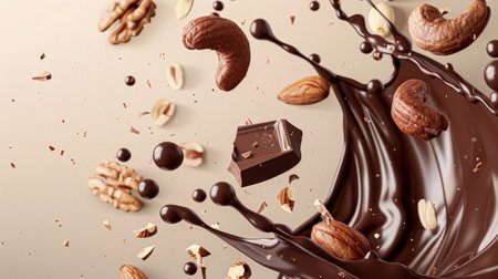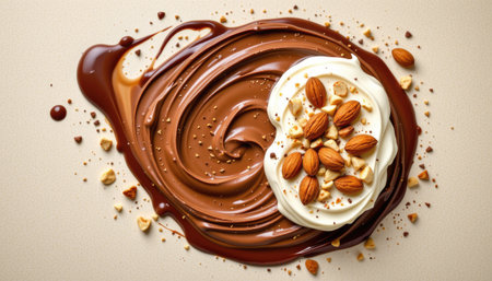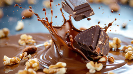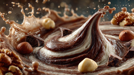 This captivating image showcases a rich chocolate swirl, complete with splashes and a scattering of nuts, creating an indulgent dessert masterpiece.