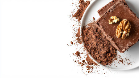 Decadent chocolate fudge dessert with cocoa and walnuts on a white plate