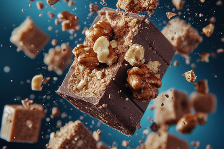 Floating chocolate bars and walnuts in mid-air on blue background.