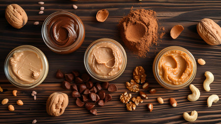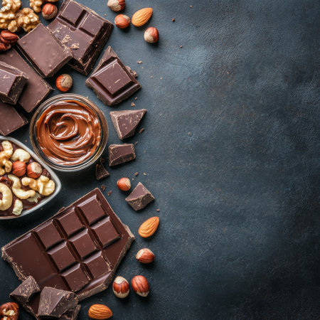 A rich and enticing collection of dark chocolate pieces, nuts, and a creamy chocolate spread situated on a dark surface. The textures and colors create an appealing visual feast.