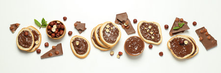 Sweet chocolate spread on bread with cream and bars. Top view.
