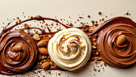 This image features a decadent swirl of chocolate and cream, topped with almonds and hazelnuts, creating an elegant and appetizing dessert presentation.