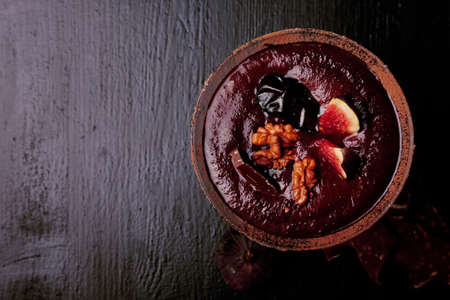 Chocolate mousse dessert with cinnamon, walnuts and figs served in cocktail glass