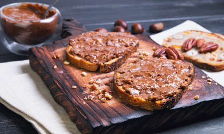 Sweet sandwiches with peanut paste butter, nuts almonds, pecans, chestnuts, served on Board, dark black surface wooden background