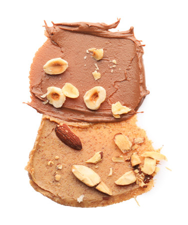 Top view of tasty peanut butter and chocolate paste sprinkled with crushed nuts placed on white table