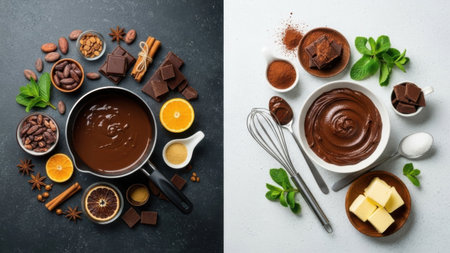 The image features a detailed setup for preparing a chocolate dessert. It includes a pot of chocolate sauce, various ingredients such as cocoa powder, chocolate pieces, spices, and fresh mint leaves. The image is on a transparent background, making it suitable for various digital applications. The setup is isolated on a white background, emphasizing the ingredients and the preparation process.