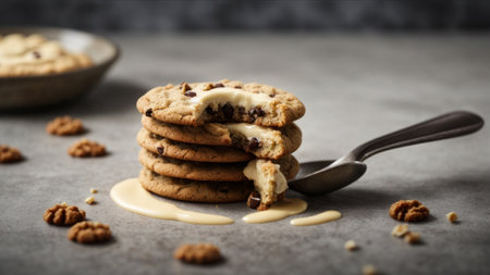 Chocolate chip cookies with walnuts and condensed milk on gray background