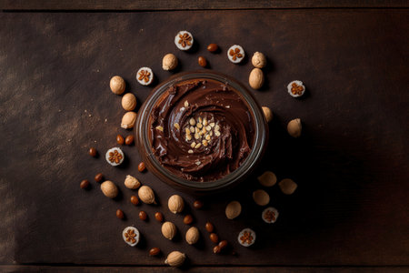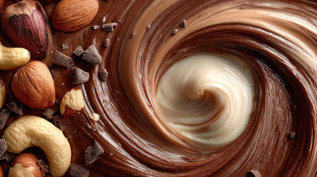 A captivating swirl of rich chocolate mixed with cream, surrounded by assorted nuts and chocolate chips, perfect for dessert ideas or culinary inspiration.