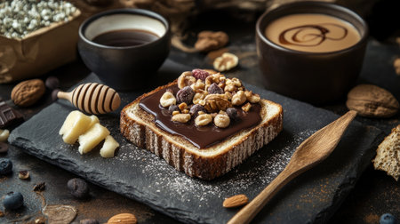 A rustic slice of artisan bread topped with rich chocolate spread, nuts, and honey, paired with coffee, creating a warm and inviting dining moment.