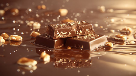 Broken chocolate bar with nuts and caramel, styled elegantly on a mirror-like surface with reflections