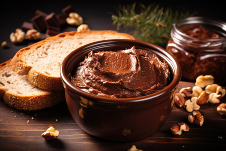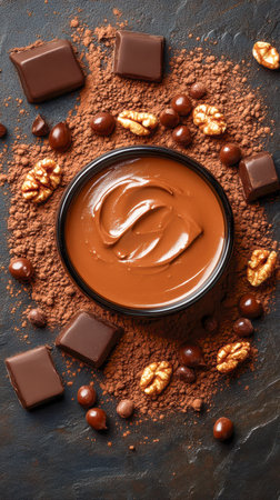 A rich and creamy chocolate spread in a bowl, surrounded by dark chocolate squares, cocoa powder, and walnuts, creating a luxurious gourmet dessert scene.