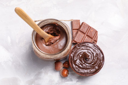Chocolate-nut paste in a glass jar on a light table. With a spoon, the paste pours into the jar