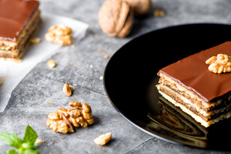 Gerbeaud Cake. Zserbo. Traditional Hungarian multi-layer cake with plum jam, nuts and covered with chocolate glaze