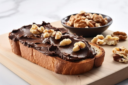 Closeup of bread board with chocolate spread and hazelnuts on white backdrop.