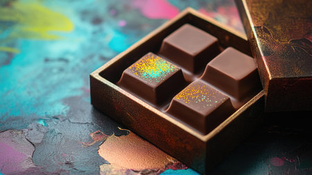 An exquisite assortment of gourmet chocolates elegantly arranged in a decorative box. The vibrant abstract background enhances the rich textures and colors of this indulgent treat.